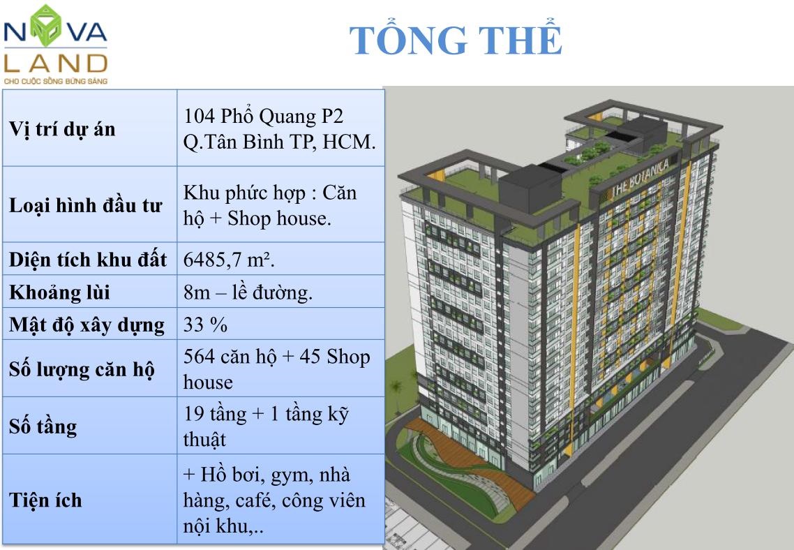 - The Botanica là một trong rất ít dự án đẳng cấp trong khu vực hội tụ nhiều tiện ích nội khu hiện đại như công viên, phòng Gym, khu thương mại và ẩm thực. Nằm ngay trung tâm quận Tân Bình, Cách sân bay Tân Sơn Nhất chưa đến 5 phút di chuyển,